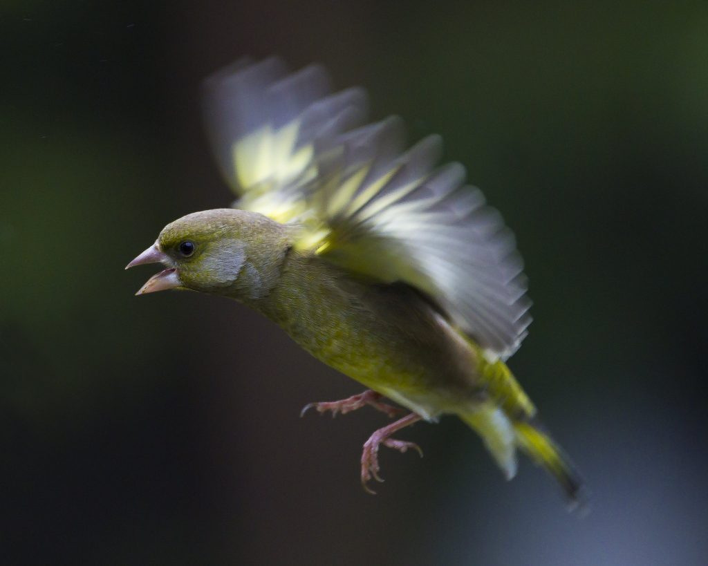 A common bird of woodland, farmland and hedges, and a regular garden visitor, the Greenfinch’s distinctive green-yellow plumage and sociable nature make it a familiar and welcome sight at bird feeders, especially in the winter when they sometimes form mixed, often quarrelsome, flocks with other finches. Similar in size to a House Sparrow, male Greenfinches are more colourful than slightly duller females and juveniles, having more visible yellow in their plumage. Watch out for the yellow wing and tail flashes of the males during their pirouetting courtship flight in the spring.